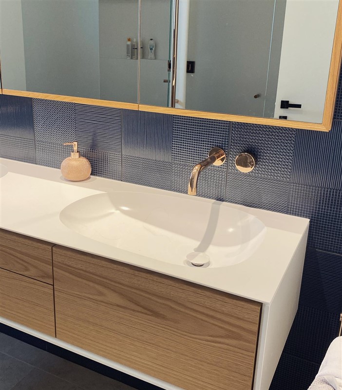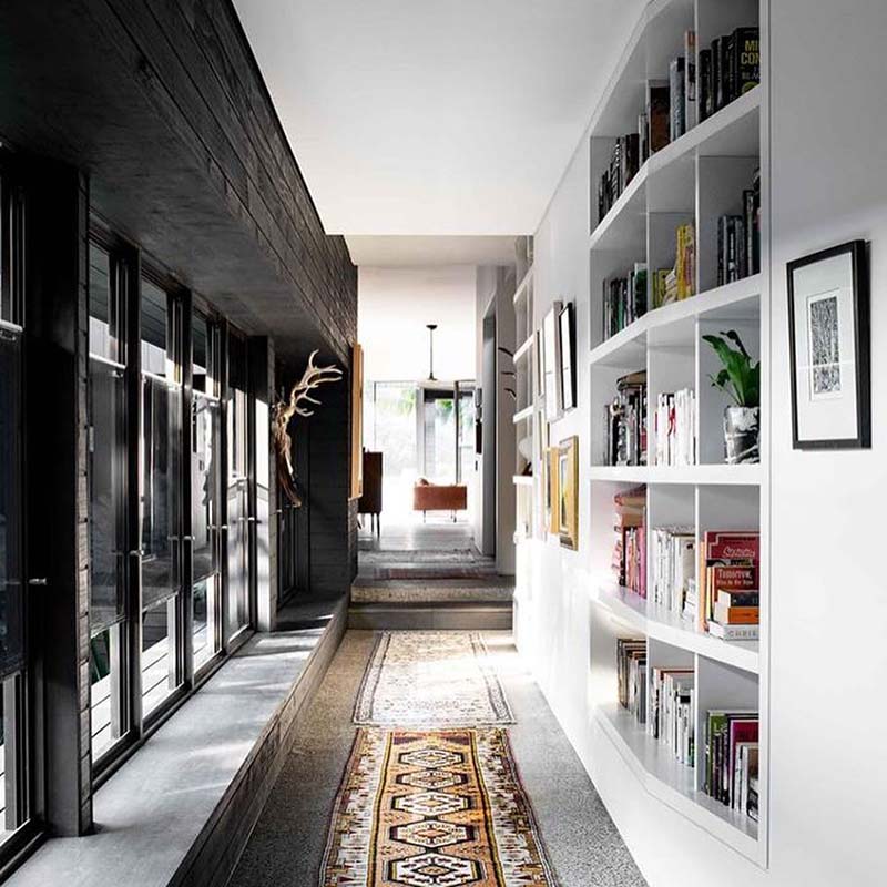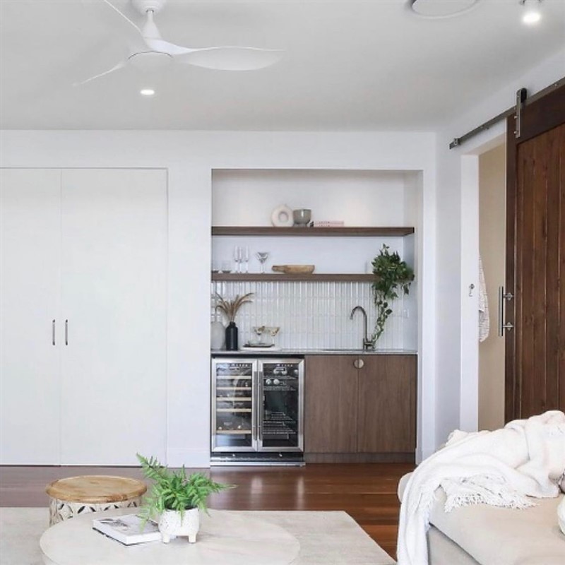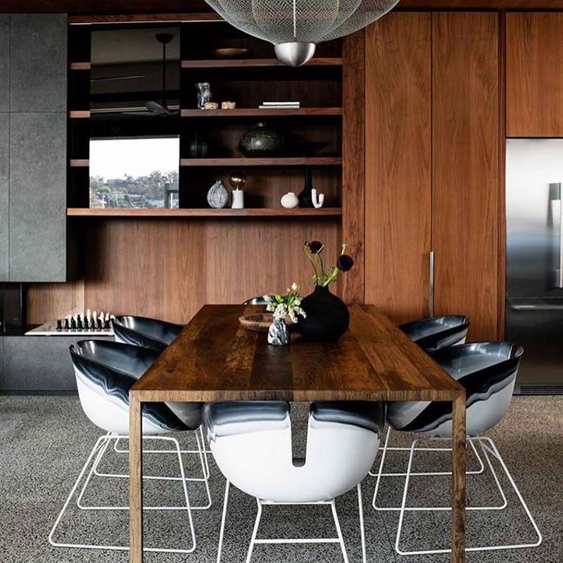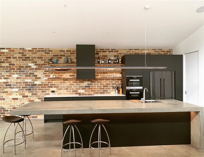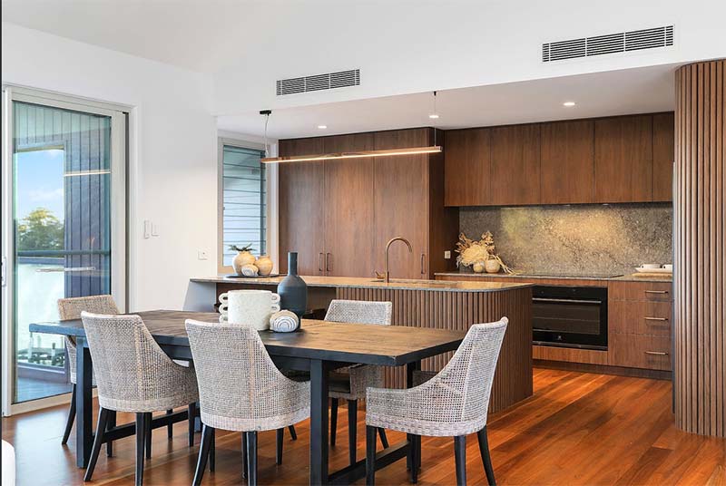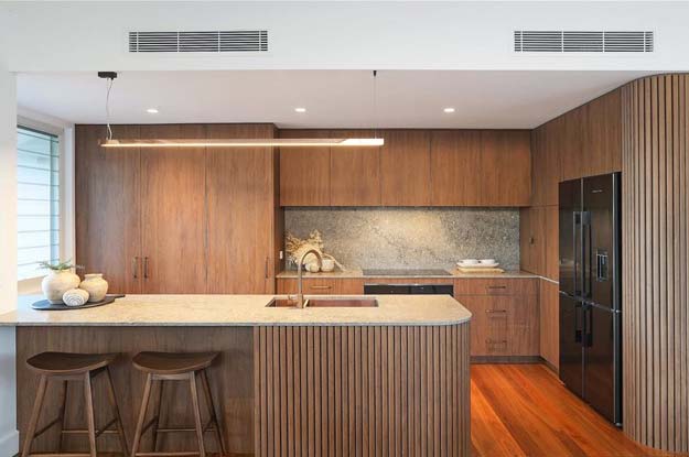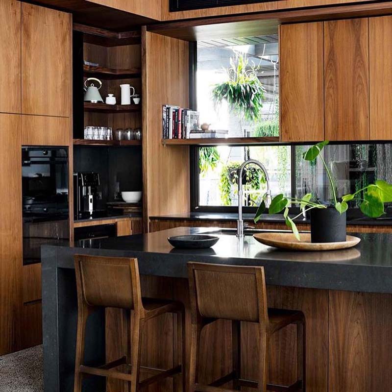 Homes to Love - "Kitchen Walnut-veneer cabinetry by Dewars Cabinets is matched with a monolithic island bench topped with Caesarstone in Raven"