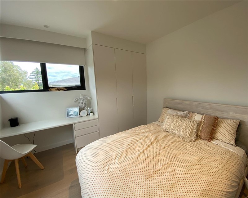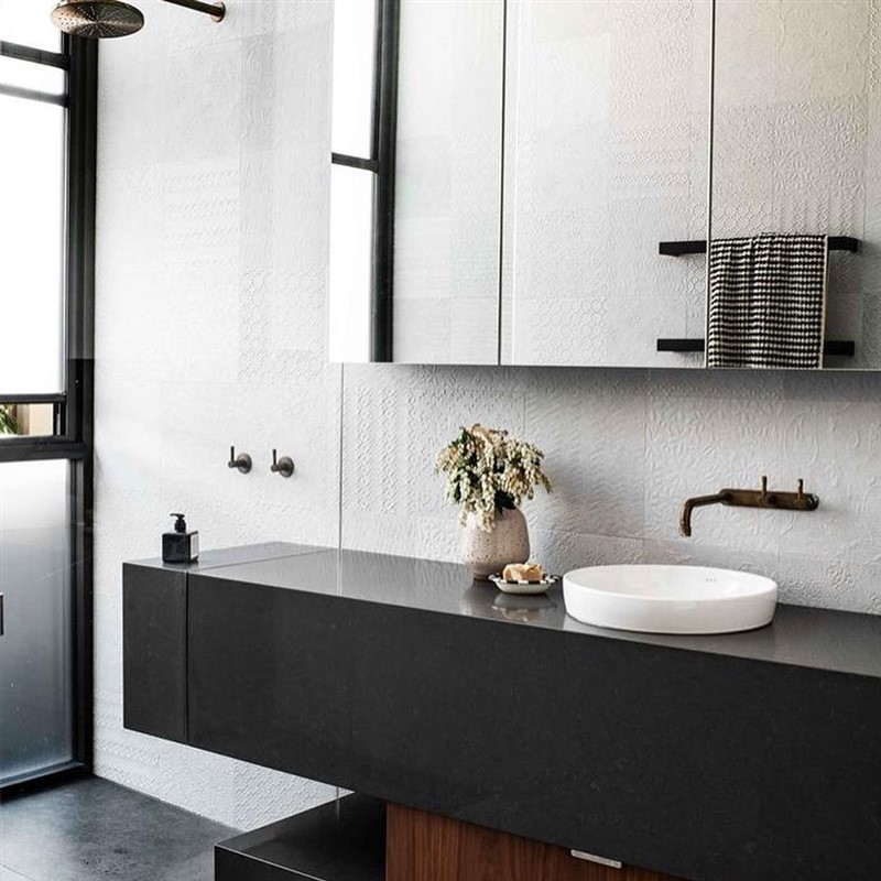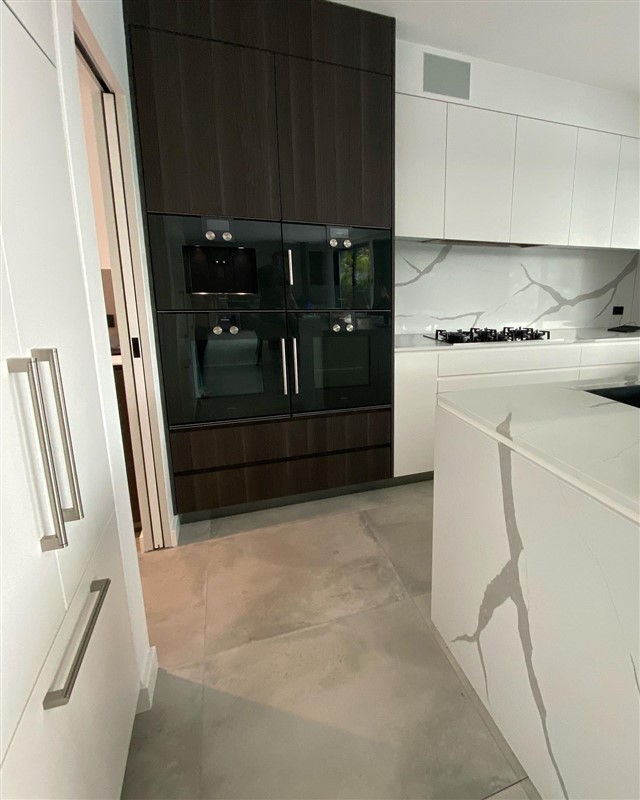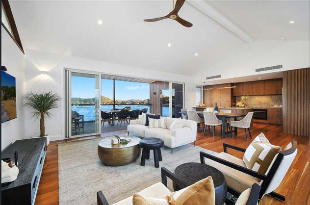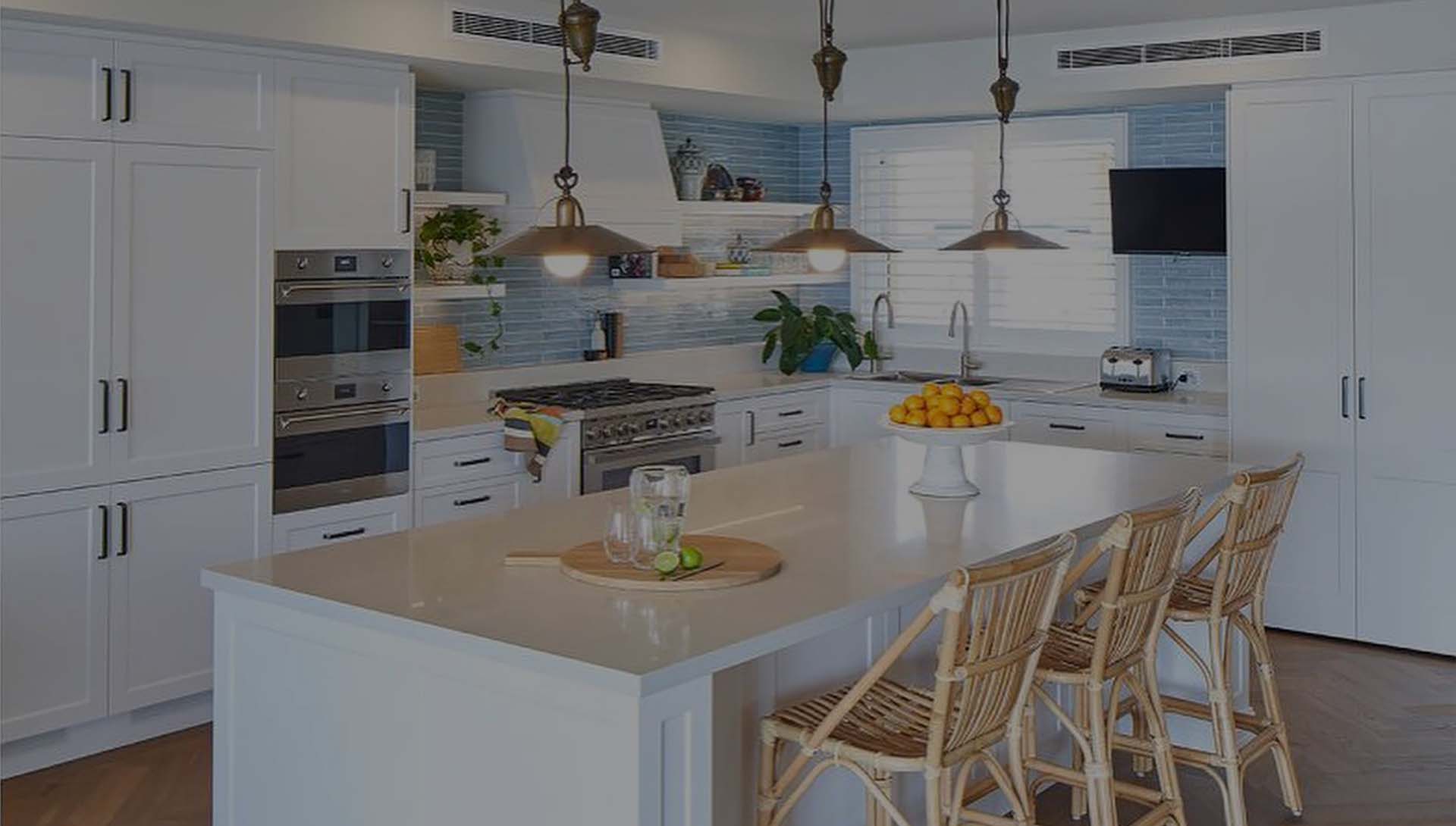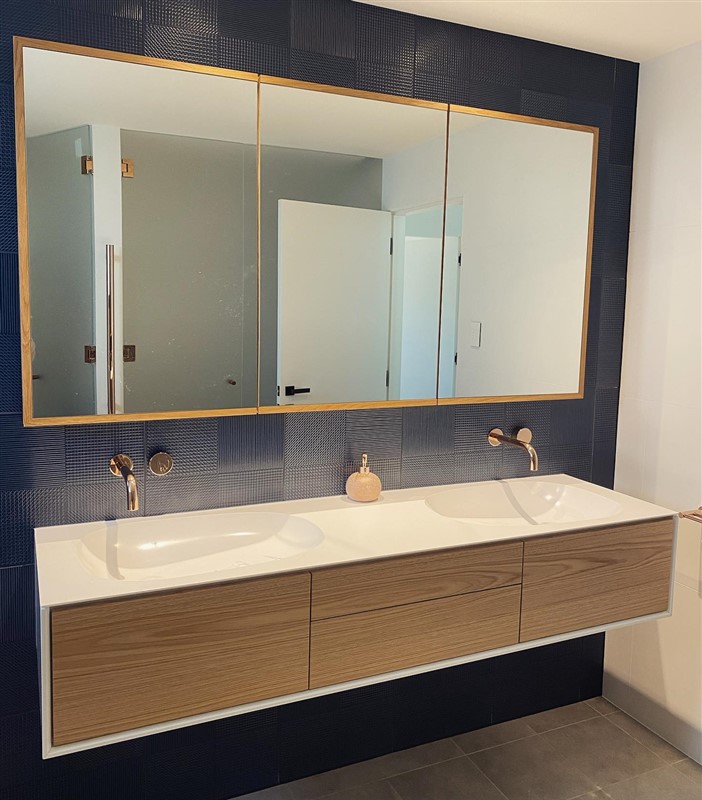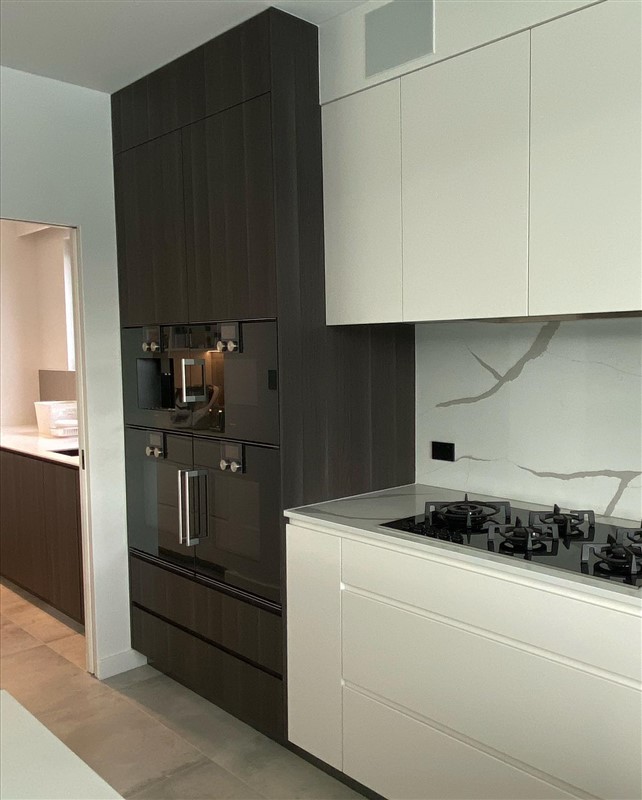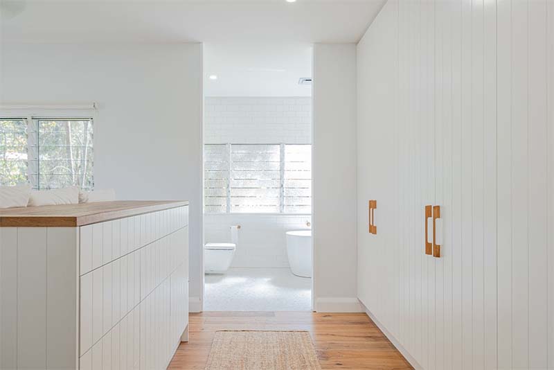 Homes to Love - "Kitchen Walnut-veneer cabinetry by Dewars Cabinets is matched with a monolithic island bench topped with Caesarstone in Raven"
