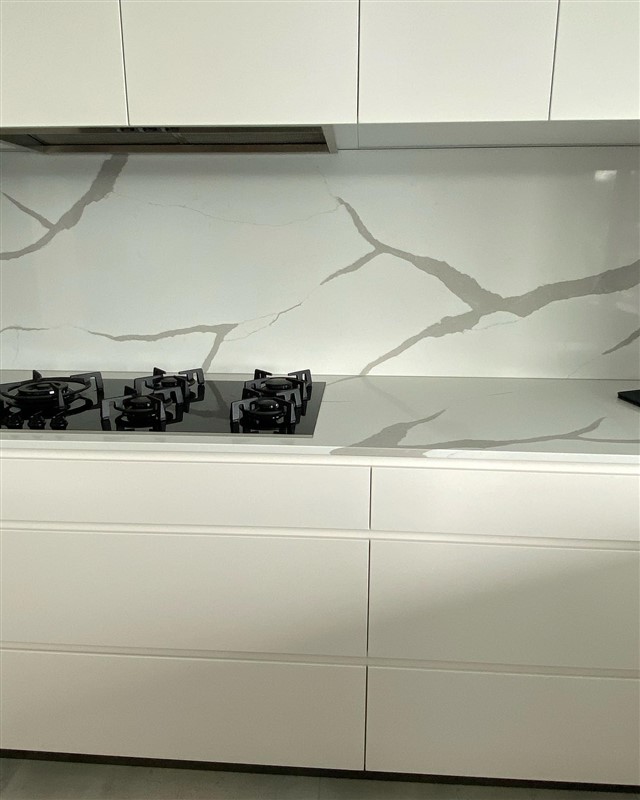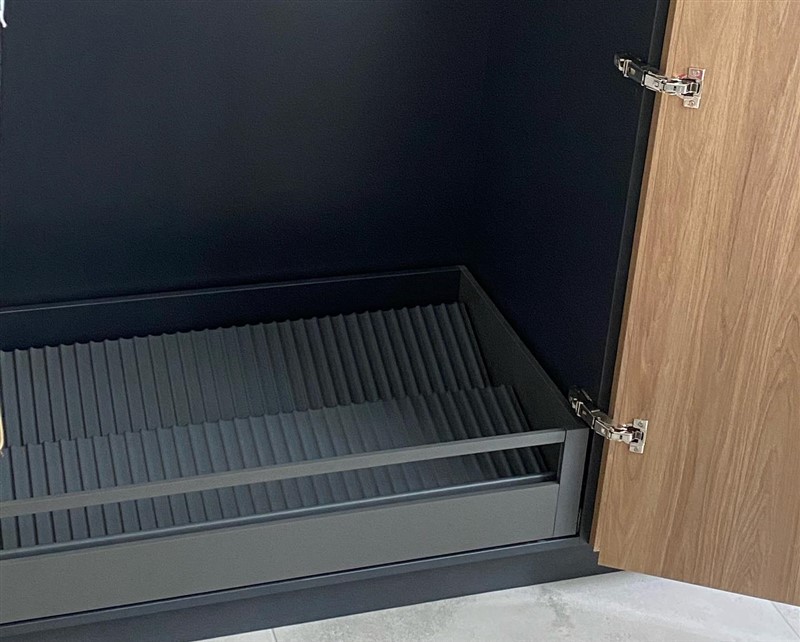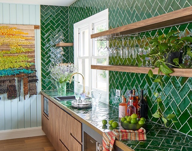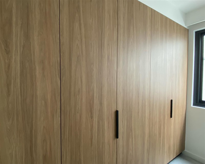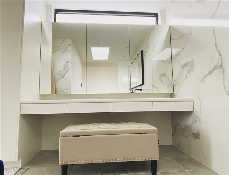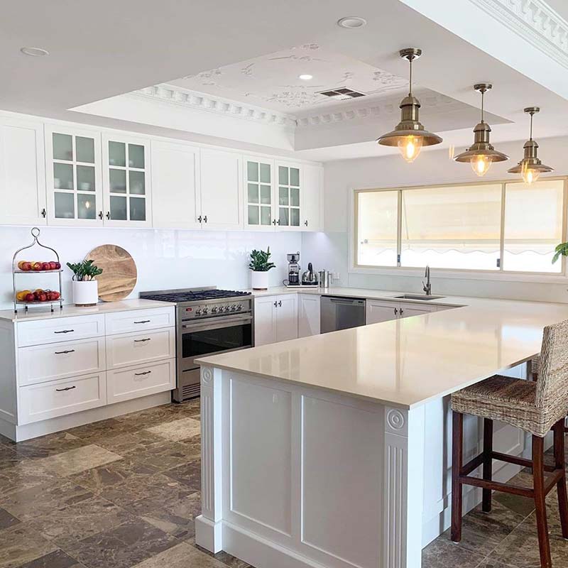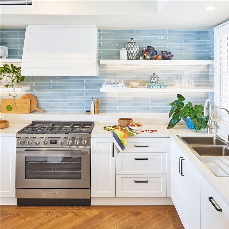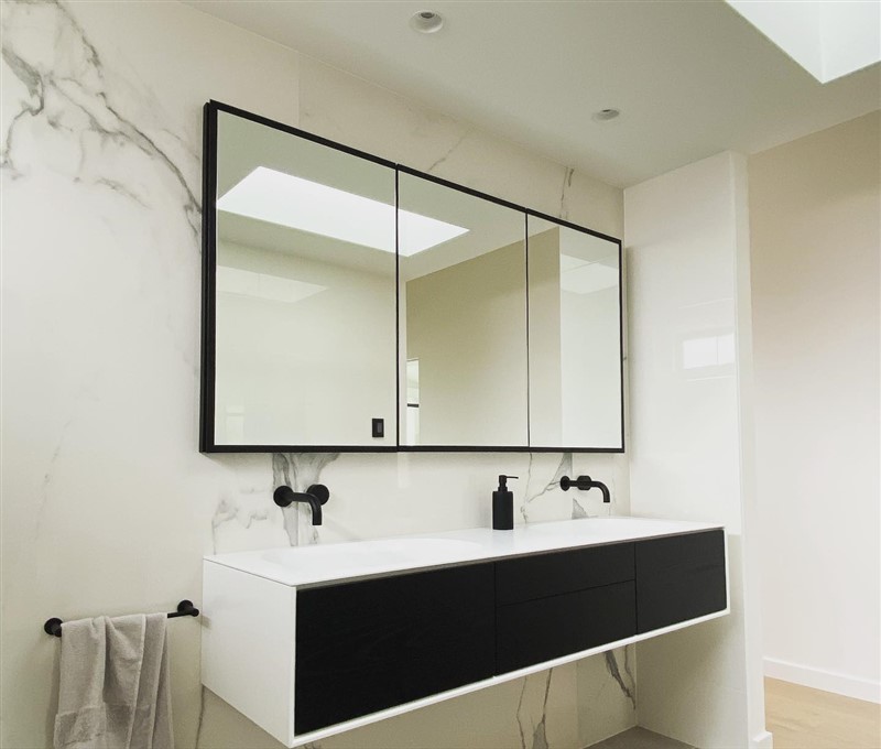 Homes to Love - "Kitchen Walnut-veneer cabinetry by Dewars Cabinets is matched with a monolithic island bench topped with Caesarstone in Raven"
